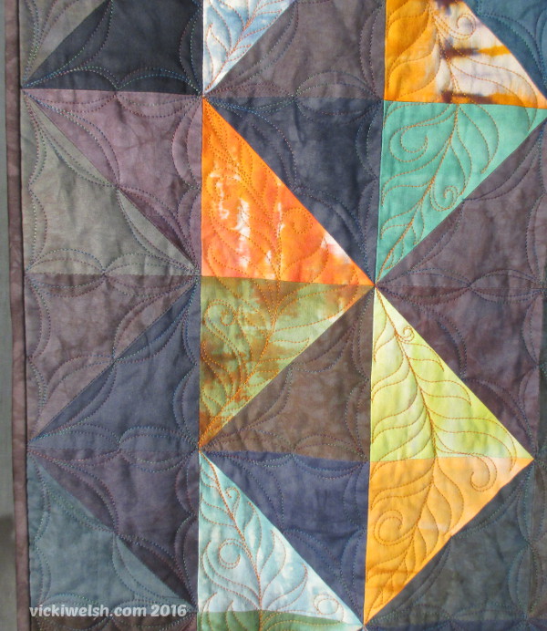 I used Superior Rainbows thread in the dark blocks with So Fine in the bobbin using a continuous curve pattern. The feathered ferns in the color blocks is Magnifico with orange So Fine in the bobbin. The batting is Quilter’s Dream Blend in black. Black batting was a must in this one!