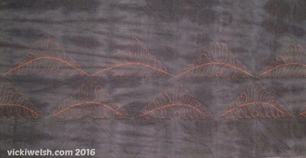 The backing is a hand dyed black texture. The orange thread on the feathered ferns shows up great.
