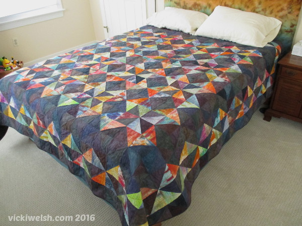 This was one of 3 quilt tops that I made in 2014 during my HSTeria Quilt Along. This quilt was born of a need to reduce some fabrics in my stash. A year or so before I started this Dharma Trading stopped making my favorite black dye. That sent me on a mission to mix my own black dye recipe and, after 60 tries, I finally got one. But that meant that I had 59 fat quarters of a lot of failures in dark colors from blues to greens to browns to purples. All of the dark fabrics in this quilt are from that recipe testing. The bright colors are my “waste” fabrics. They are strips of muslin that I use in dyeing my gradients. They catch excess dye on the edge of the bin. I love these fabrics and used them once before in my Catena quilt.