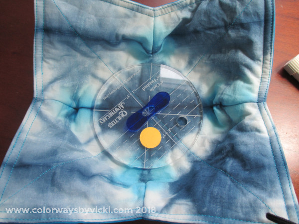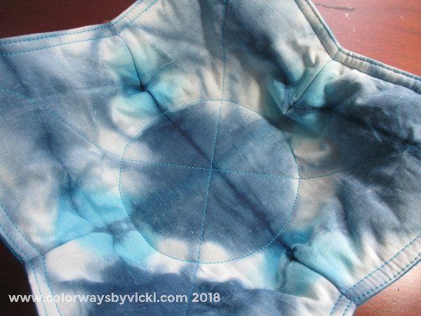 Smooth out both layers together and spread out the center flat. I found that a 4″ circle template fit perfectly so I chalked a line around the template and stitched the circle through all layers. You could stitch anything in here. You just need to hold the 2 layers of the bowl together. Now the people that you make these for can use them over an over and they will think you are a genius gift giver!