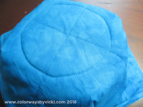 One piece of batting is cut 1/2″ smaller to reduce some of the bulk on the edge of the bowl.