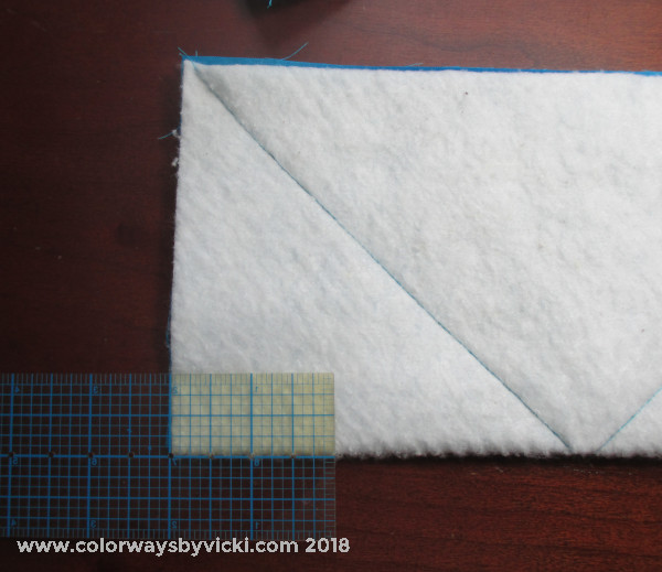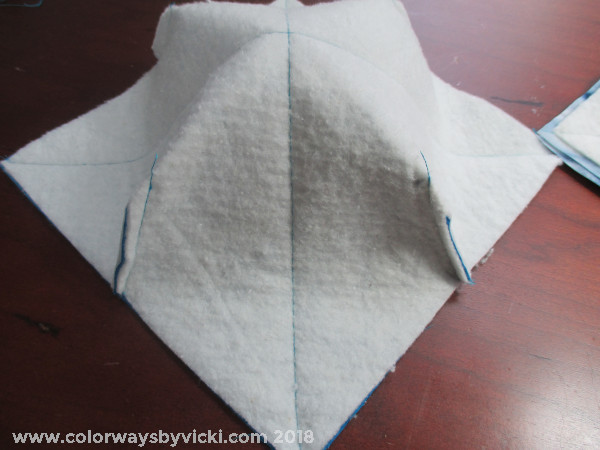 Stitch a dart on all 4 sides of each fabric. To create the dart fold the side in half, batting side out. Mark 1″ from the fold on the cut edge and 2″ along the fold from the edge. Draw a line to connect the 2 points and stitch. Back-stitch at the point. Don’t backstitch at the edge. When we turn the bowl it will help that the stitches cam pull apart a bit on the edge.