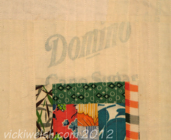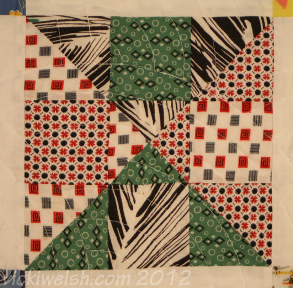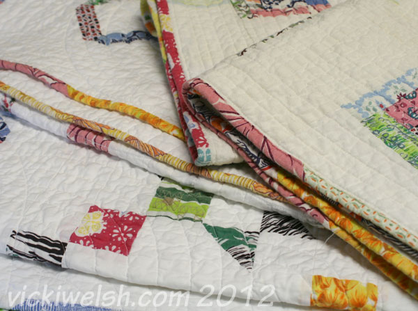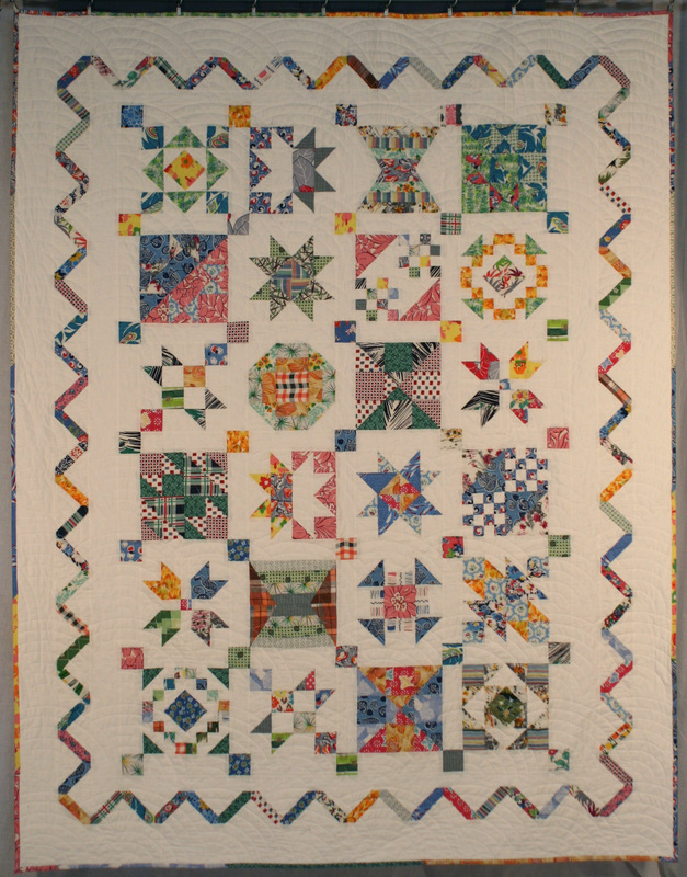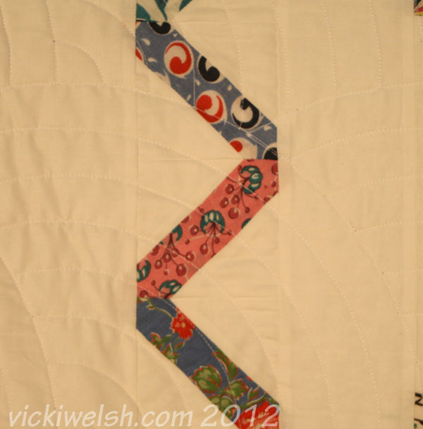 This quilt was made in an online block of the month program. The fabrics are vintage feedsacks and some belonged to my Great-Grandmother FLora. It’s quilted with her favorite motif, Baptist Fans