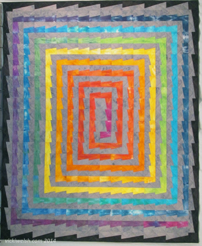 I made the top in 2013 when we did the Fractured QAL. These are all hand dyed fabrics. The color fabrics are from my dyeing “waste fabrics”. You know I treasure them and I use them a lot. It was fun to find the colors for this quilt.The pattern is from the book Material Obsession by Kathy Doughty.