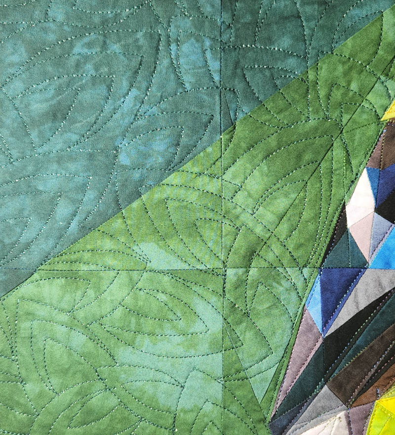 Within the bird and foliage, I quilted straight lines adjacent to the seams (to avoid some of the bulk). I just wanted to do enough to stabilize the quilt. I was not trying to add any additional design elements so that the fabrics and piecing take center stage.