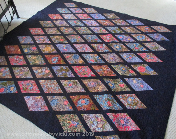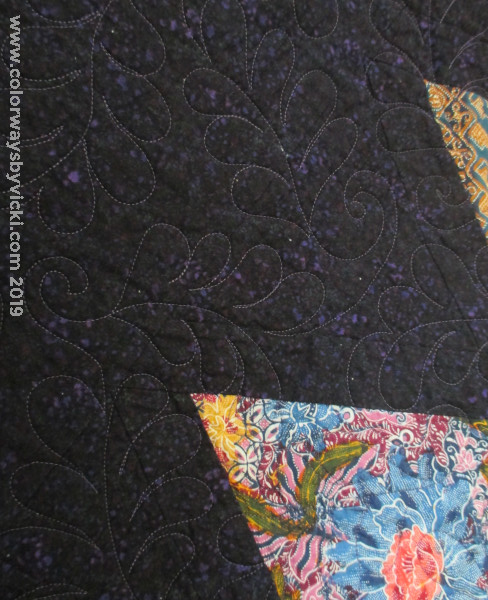 I sewed the diagonal rows together in August and was piecing the top in September. By November it was on the frame for quilting. This was our winter quilt so the batting is Warm and Natural, my favorite for a heavy winter quilt. The quilting would never show on these busy fabrics so the quilting is a simple overall feather pantograph with Superior Highlights in the top and So Fine in the bobbin. The quilt is now owned by my friend, Kim and she uses it daily as a sofa quilt.