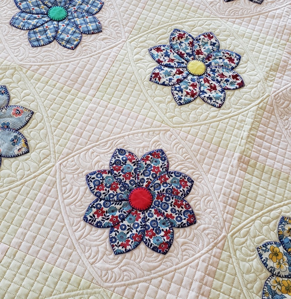 In this photo the quilt is spread over a queen size bed. It’s huge, just the way that I like my own quilts. Because the first quilt had a white background I decided to go a different route and make this one with pale pink and yellow fabrics for the background. The blanket stitch applique is done in a dark blue.
