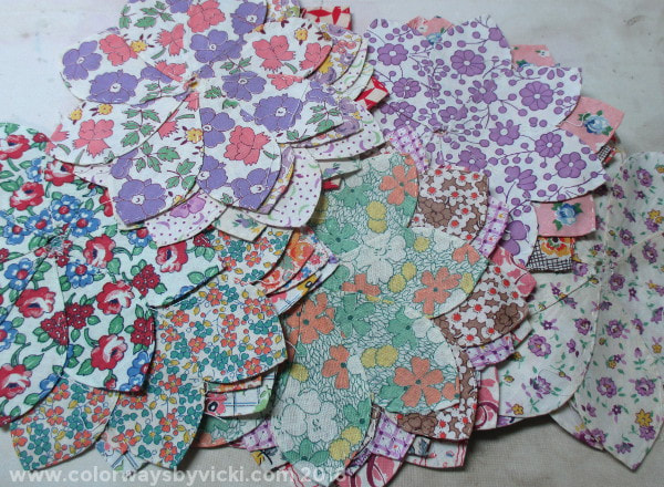 I was at the Virginia Quilt Museum and saw a large, gold, beat up tin in the gift shop and it was FULL of these basted flowers and petals. I have no idea where these flower came from but, clearly, the woman didn’t really like the quilting part of the process. I made up a story that I thought that this woman was having an affair with a man in the next town over and she worked on these as a cover activity while on the bus to the next town. No one would suspect a woman sewing of doing anything other than going to visit her family.