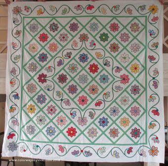 A few years after the purchase I spent a weekend washing all of the blocks and dividing them into piles for quilts. The first pile was a stack of flowers in all colors and each flower was a different fabric. With those I made the quilt top to the left. I worked on the applique for both of these quilts while watching TV and traveling. I finished this first quilt top in May 2018 and it’s still waiting to be quilted.