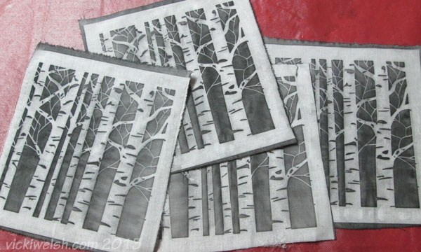 I was limited anyway because I only had one stencil. So I could only print one image at a time. I did my printing on a day when I was doing some quilting so I was around to check the print and set up the next one about every 30 minutes. I mixed my paint (about half water and half DyeNaFlow) and put it in a container with a lid and I kept my paint brush in a ziplock bag so I didn’t have to was it out every time.