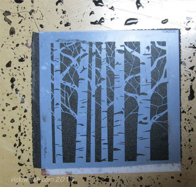 My print surface is a piece of cardboard covered in plastic. In this image I’ve painted the fabric placed the stencil on top. You can tell that the fabric is pretty well saturated.