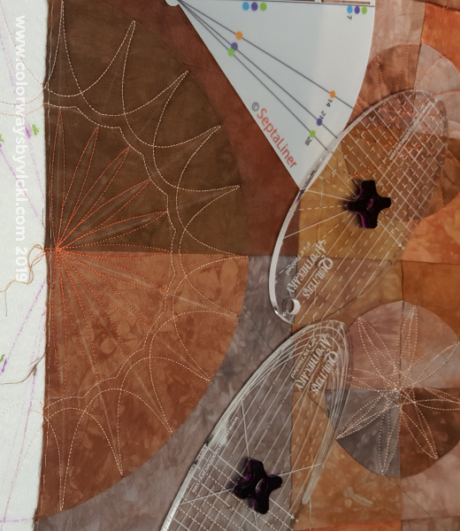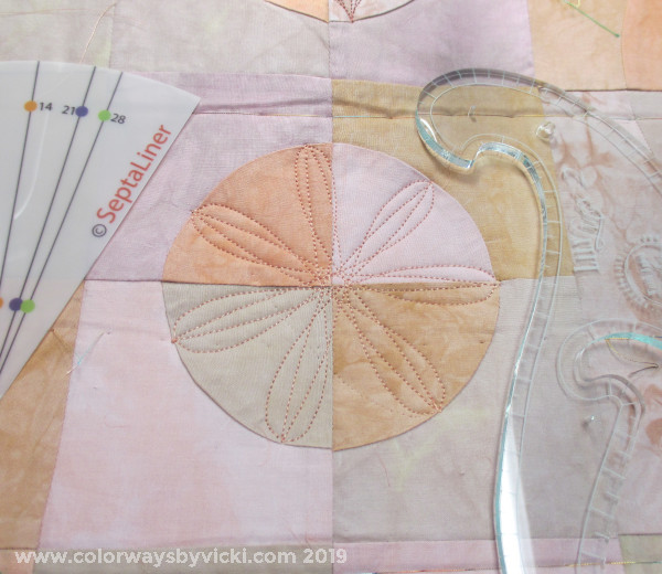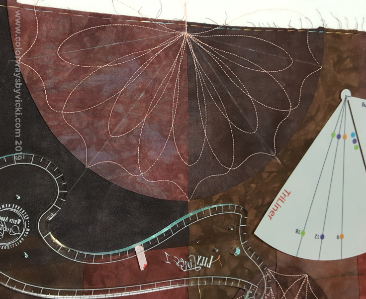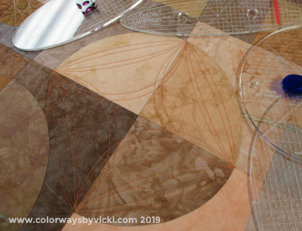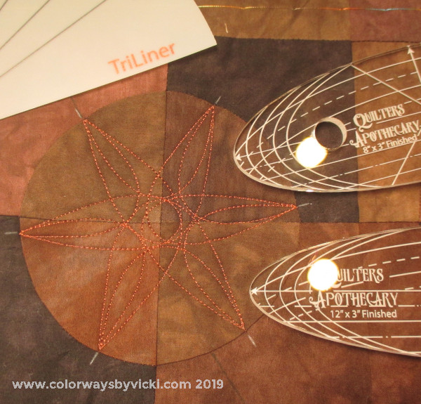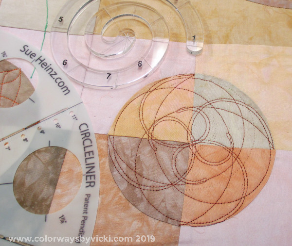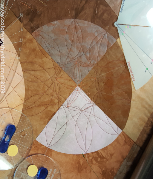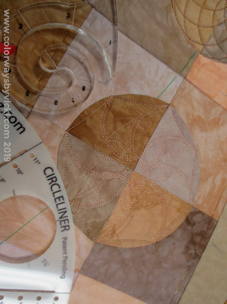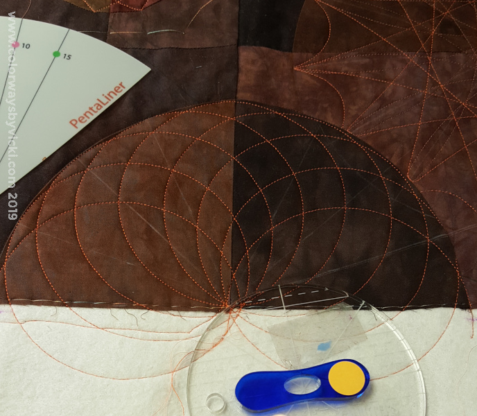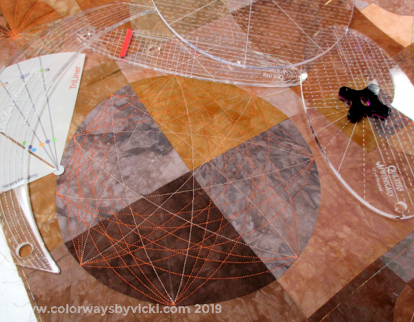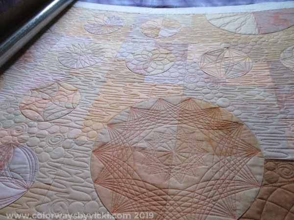 I used Sue Heinz’s Circleliner tools to mark the divisions of my circles and a variety of longarm rulers to do the quilting. I relied mostly on the complete set of circle and ovals from Quilter’s Apothecary but also used ProPebbles from Lisa Calle, Boomerangs from DeLoa Jones and Lily Lines from Bethanne Nemesch. These are some of the 90+ designs in the quilt.