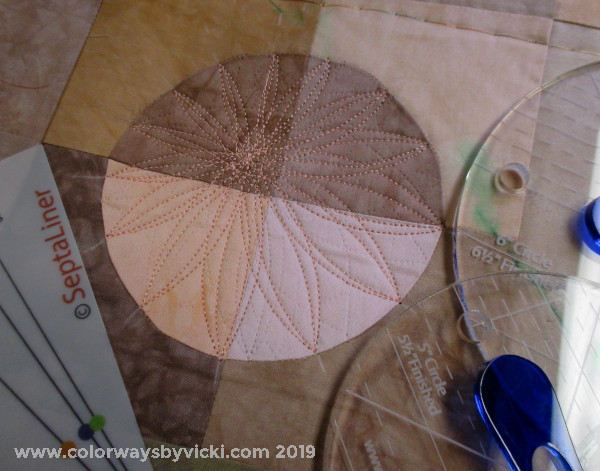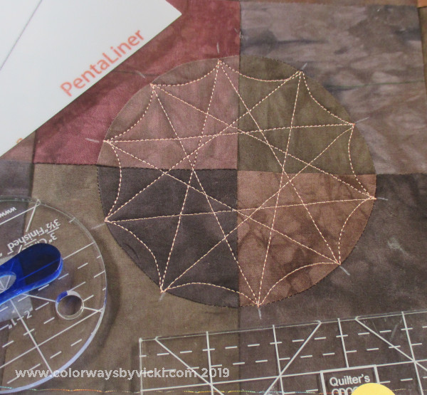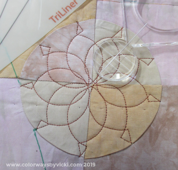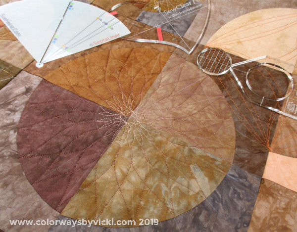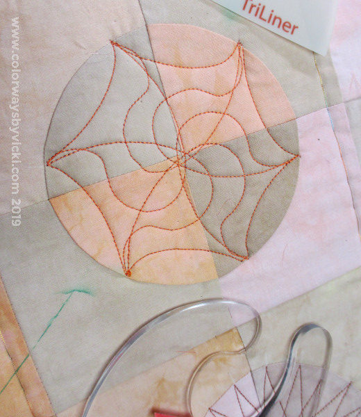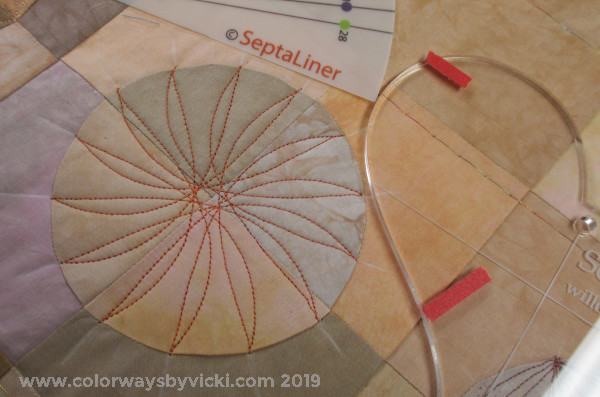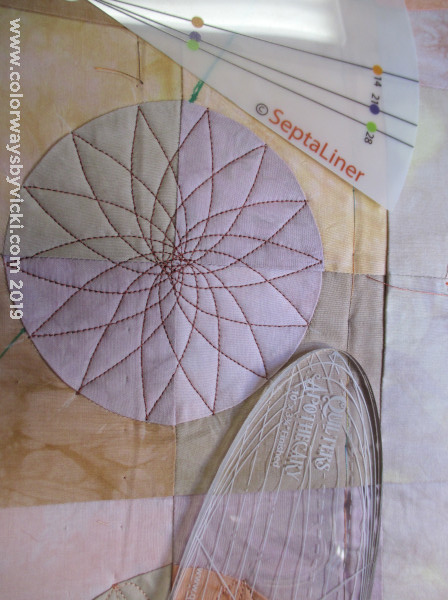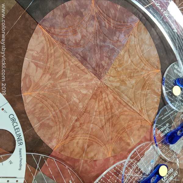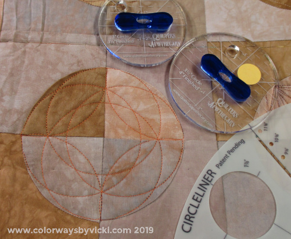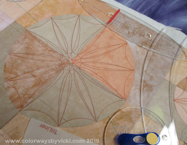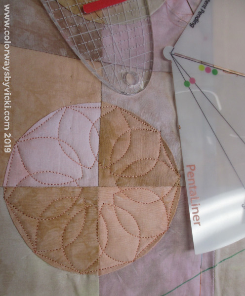 I used Sue Heinz’s Circleliner tools to mark the divisions of my circles and a variety of longarm rulers to do the quilting. I relied mostly on the complete set of circle and ovals from Quilter’s Apothecary but also used ProPebbles from Lisa Calle, Boomerangs from DeLoa Jones and Lily Lines from Bethanne Nemesch. These are some of the 90+ designs in the quilt.