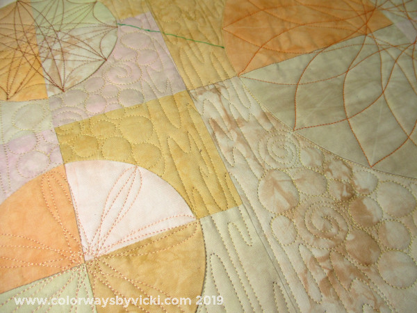 The backing is a hand dyed purple spiral. Had I given any real thought to this quilt I would have used a dark solid fabric so that the motifs would show. But I loved this fabric and wanted to use it.