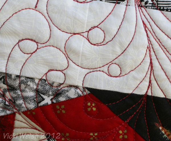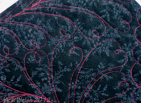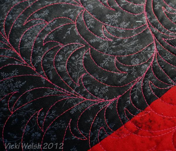 I decided to quilt in on all-over feathers using Suzanne Earley’s Meandering Magic (which, I believe, are out of print). I didn’t want to do the same feather for 5 miles so instead I did lots of different feathers. Some are from Suzanne’s book, some from other places and some completely made up.