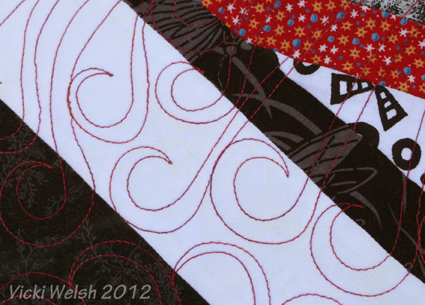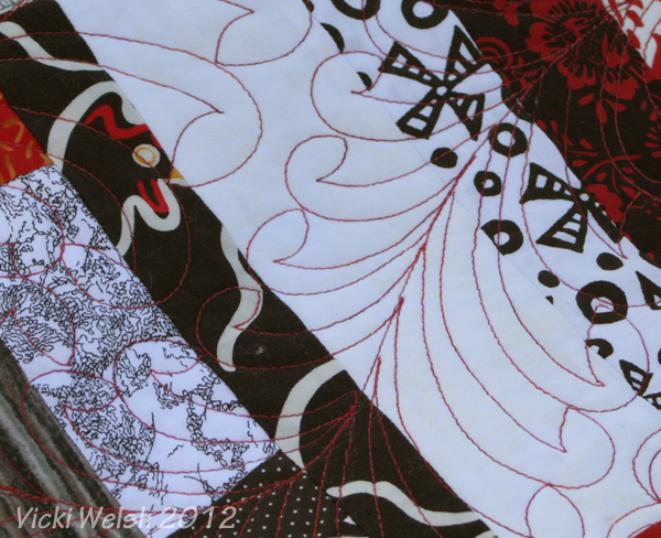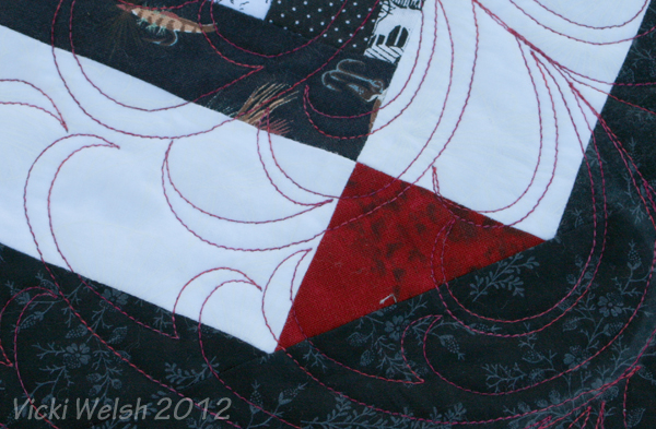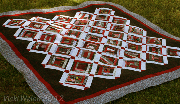 I had this top completed about 2 years before I finally quilted it in 2012. This is the 3rd quilt in my scrap blocks “series”. I made stacks and stacks of these crumb blocks several years ago. I put all the bright scraps together and made Mardi Gras in 2006. With the blue and brown scraps I made Zig Zag last year. The greens were used in 2 veterans/QOV quilts shown on the 2012 Quilts page. Anyway, back to On Point. It’s named that for 2 reasons. Obviously part of is the setting but it also refers to my mission to stay on task and get these tops quilted. See all of the Crumb quilts here.