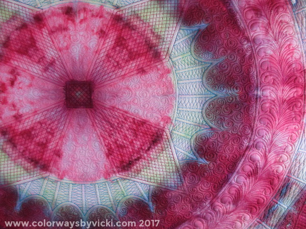This quilt had no purpose other than to get me to quilt one of my own hand dyed mandala fabrics. Like a lot of people, I avoid using “special” fabrics and once I do I want the resulting project to be perfect. I knew that I needed to get over all of that so I picked a pink mandala because that’s my least favorite color. That helped me not worry about perfection but wasn’t much for motivation! I was an admirable procrastinator with this quilt.
