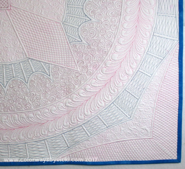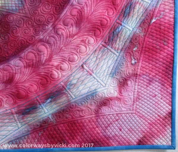 Even the thread was a lesson. The only pink threads I had were some acrylic embroidery threads that I bought from Lunn Fabrics when they closed their hand dyed shop. They are beautiful threads but didn’t run well on my APQS. I’m happy to discover that they run just fine on my Innova.