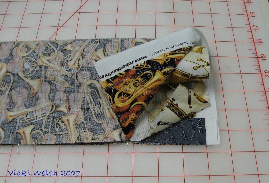 Here’s another view that shows all of the layers that are pinned together. Sew through all layers with a 1/4″ seam allowance. Total accuracy is not important here, the seam allowance needs to be “about” 1/4″. Only stitch the long edge. Don’t close in the sides!