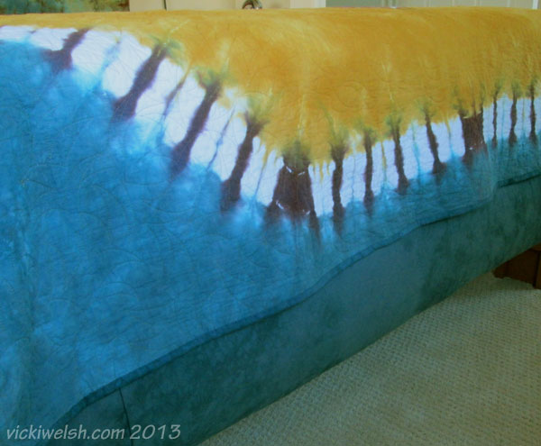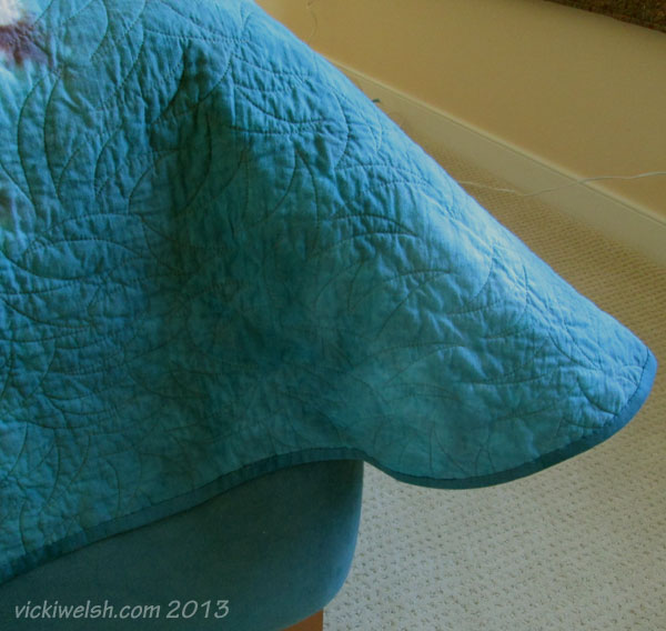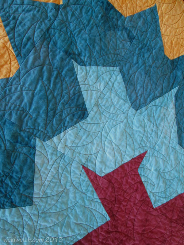 I quilted it with an overall spikey pattern. I had to do that because the quilt is two-sided. While I did get the front and back centered there was no good way to do a quilting design that would work with both sides. I think this spikey meander makes some great texture.
