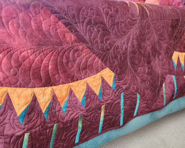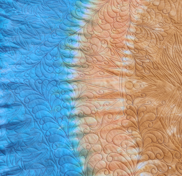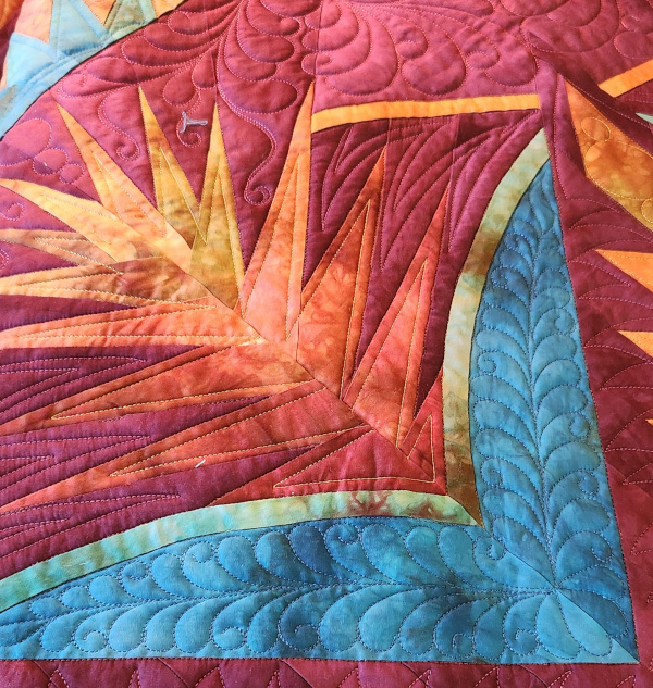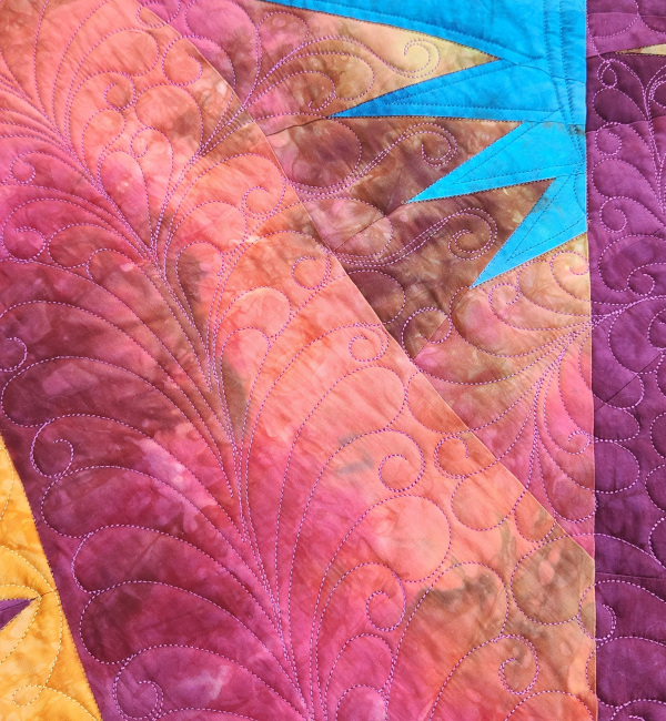 It was quilted with Superior Magnifico thread on top and So Fine on the bottom. Click on any of these photos to see a close up of some of the quilting sections. I picked 3 major motifs: feathers, spikes and circles and use those all over the quilt.