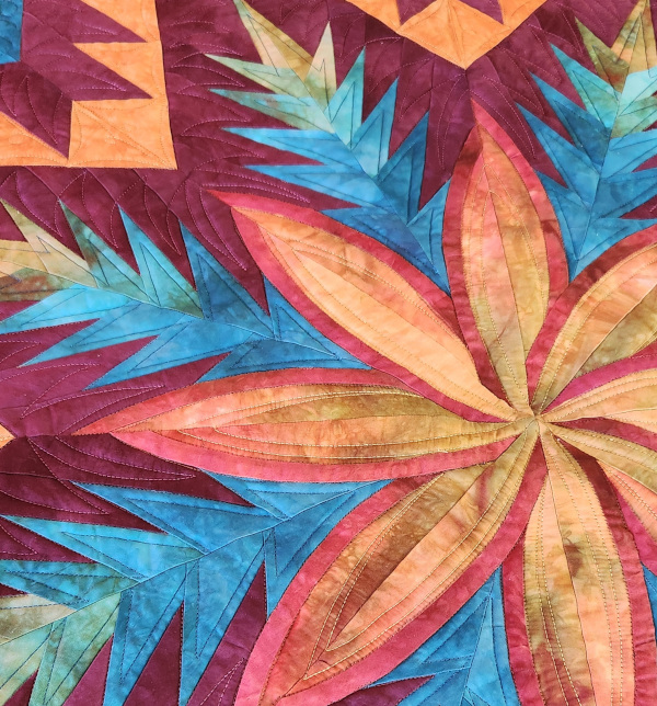 The new quilt uses the same color palette and the Tequila Lime pattern from Quiltworks. I selected one of their cormer packs to enlarge it to 99″ square. The whole thing is foundation pieced and I enjoyed every minute of making it.