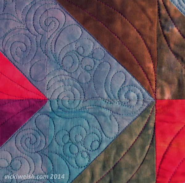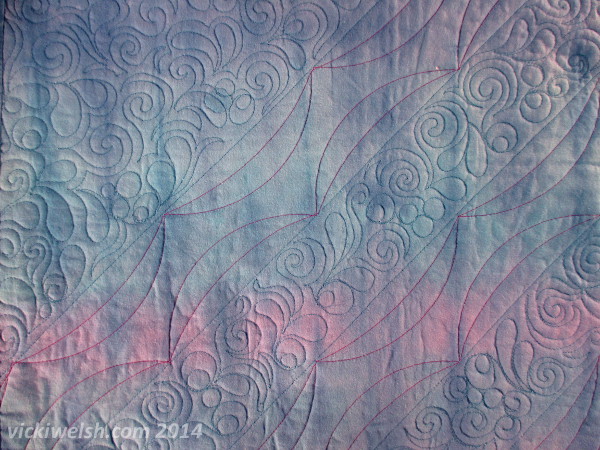 The quilting started with ditch stitching to define the separation of the blue areas from the scrappy areas. I know a lot of people don’t like to stitch in the ditch but I really believe that it’s worth the effort. I used Superior Rainbows for the free motion filler and Highlights (purple) for the ruler work. In the free motion I basically used 3 motifs: swirl, eyeballs and feather fronds.