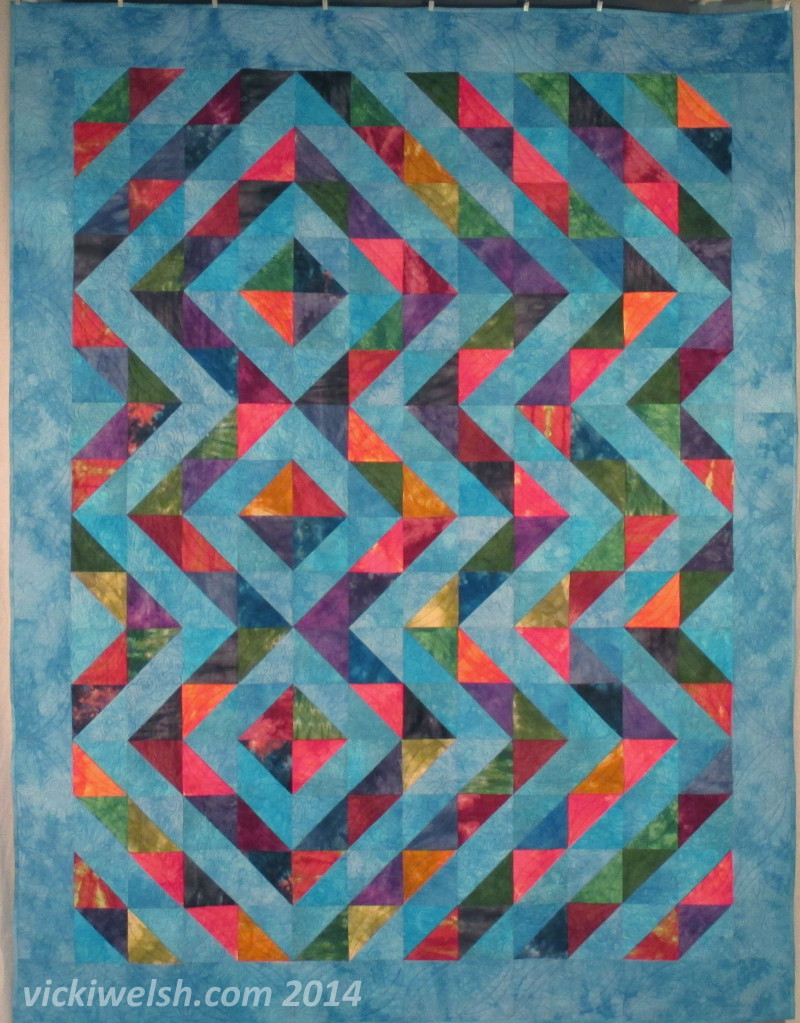 This is one of the 3 quilt tops that I made last year during the HSTeria Quilt Along. It’s all hand dyed fabrics and, aside from the border, it’s all scraps and stash fabric. After I made the center I wanted it a bit larger so I dyed a border fabric that had all of the blues from the center of the quilt.