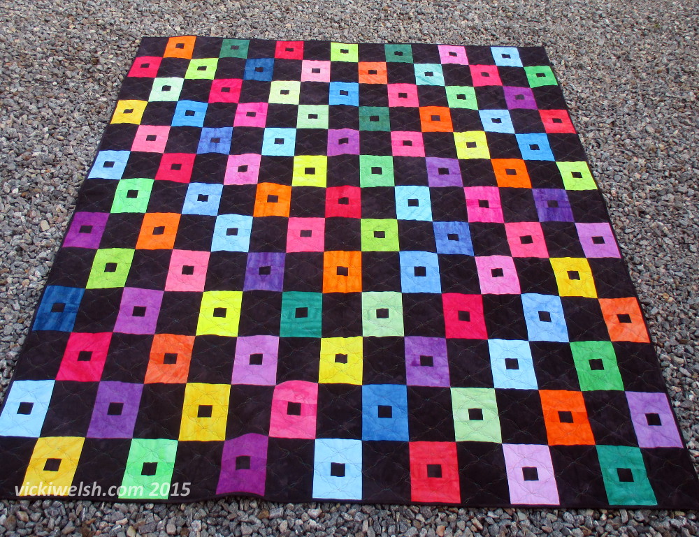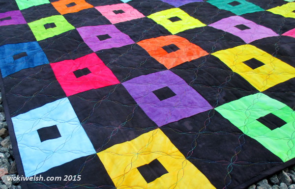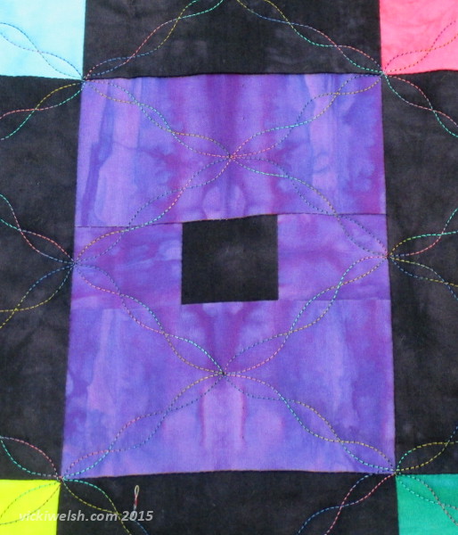 All of the fabrics are hand dyed, including the black. Most are from my Munsell Color Wheel collection. Others are from a set of fat eights that I made last year for the Rainbow Scrap Challenge.