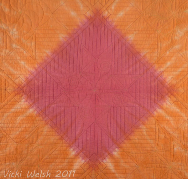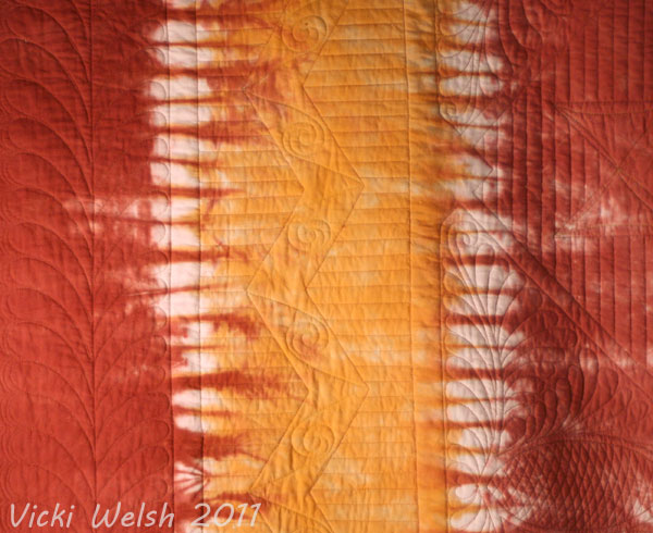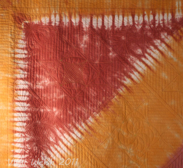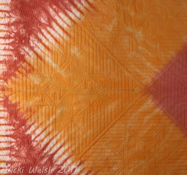 I wanted to see if I could dye a backing to go specifically with the pieced quilt pattern. This didn’t’ work out perfect, but it was darned close and it’s in Virginia Tech colors too! I pretty much followed the instructions in my own tutorial except that the quilting that I did as I was loading the quilt was only basting stitches. The original tutorial shows doing the quilting as the quilt is loaded but that isn’t possible in a quilt like this with lots of custom quilting. Instead I basted the entire quilt on the longarm and then went back and started the SID. The process worked great.