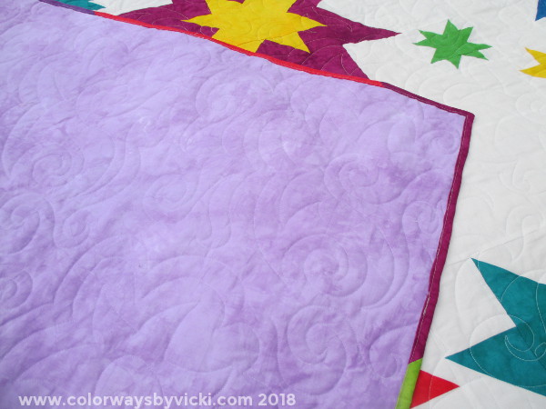 The backing is a lighter shade of the purple in the Color Wheel. It’s quilted using the Star Swirl pantograph Wonderfil Master Quilter thread in the needle and Superior So Fine in the bobbin.