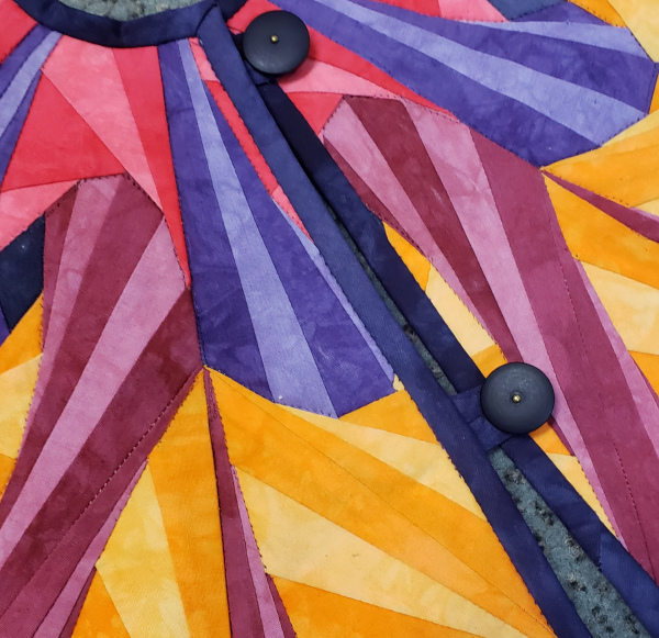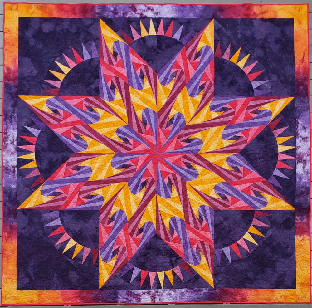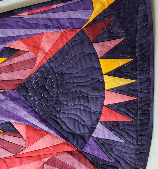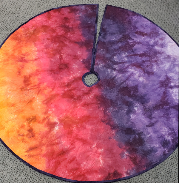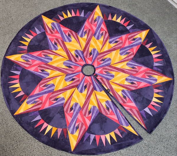 When I started making the quilt I had a lot of leftover slivers of fabric from the foundation piecing. I remembered that the pattern came in 2 sizes so I ordered the small size and made a duplicate. It has the same problems with seam buildup, especially the center. I solved that by turning the wall hanging into a tree skirt. The gradient is shown off well on the back of the tree skirt.