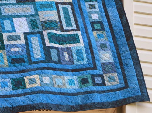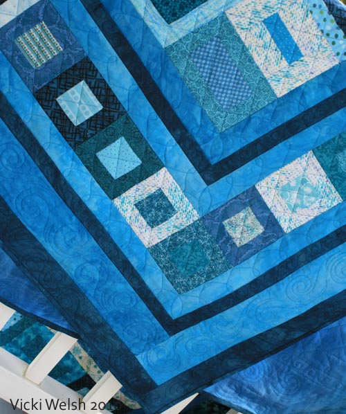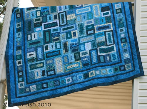 The colors in these photos are more blue than what the quilt really is. It’s much more teal. The pattern is Peaches & Dreams by Judy Laquidara. I started the quilt to use up a lot of these teal fat quarters that I was tired of seeing. As the quilt started coming together I decided that I really liked it a lot so I took the time to dye fabric for the borders. I really like how the hand dyed fabrics complement the commercial prints.