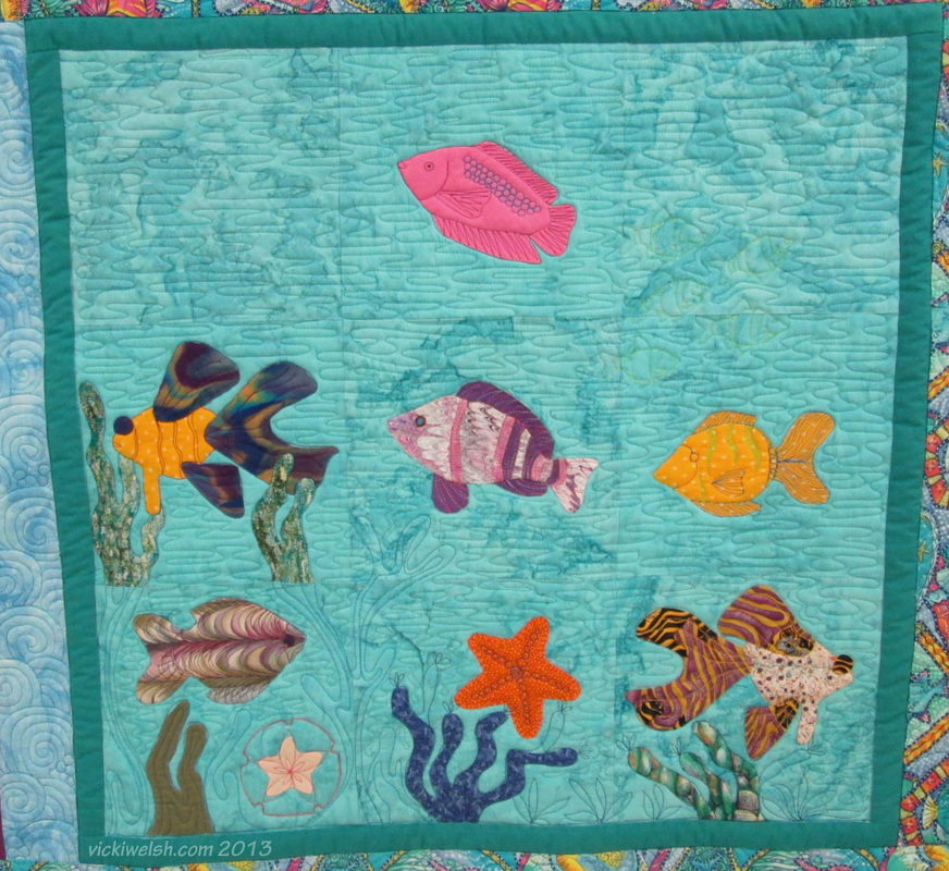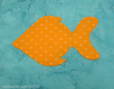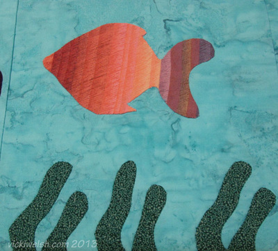 Sometime around 2000 (THIRTEEN years ago!) my club, Country School Quilters, had a series of programs on applique. Three months in a row we had a lesson on a different method of applique. I know we did freezer paper and needle turn and I can’t remember the 3rd one. At the end of the lesson we were given a square of batik fabric and a fish pattern and encouraged to applique a block and bring it to the next meeting.