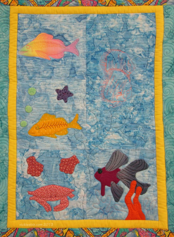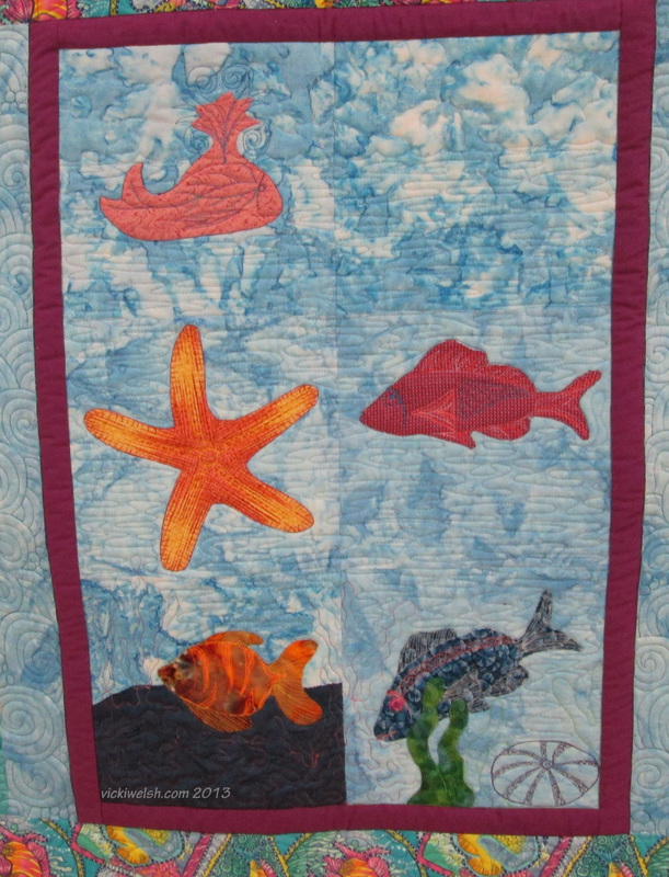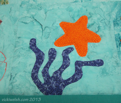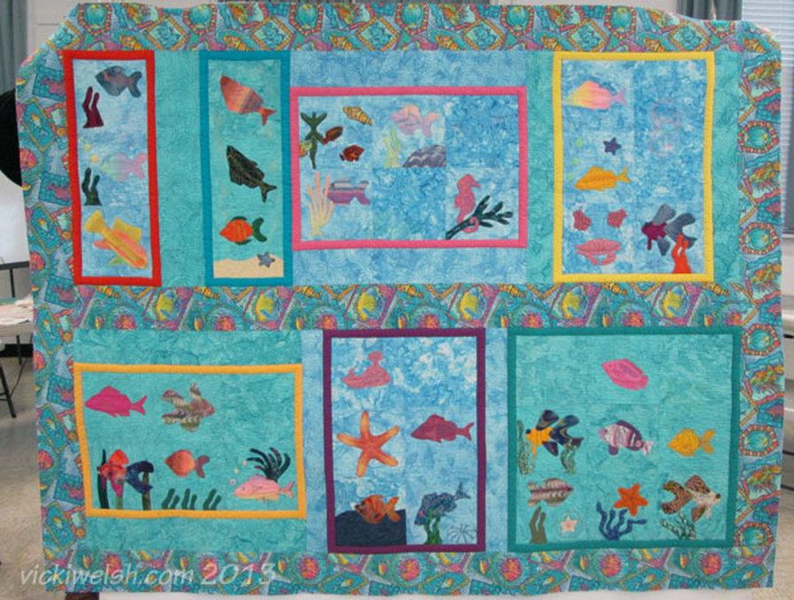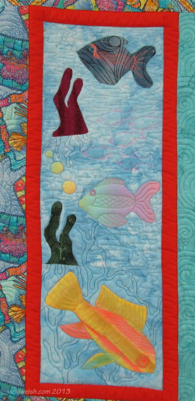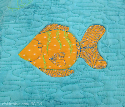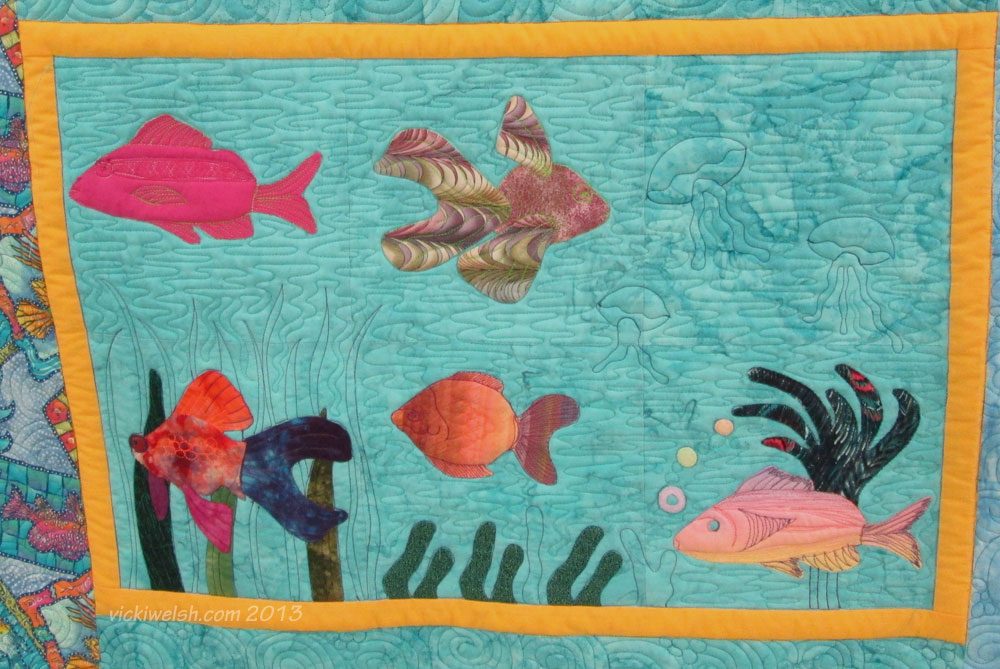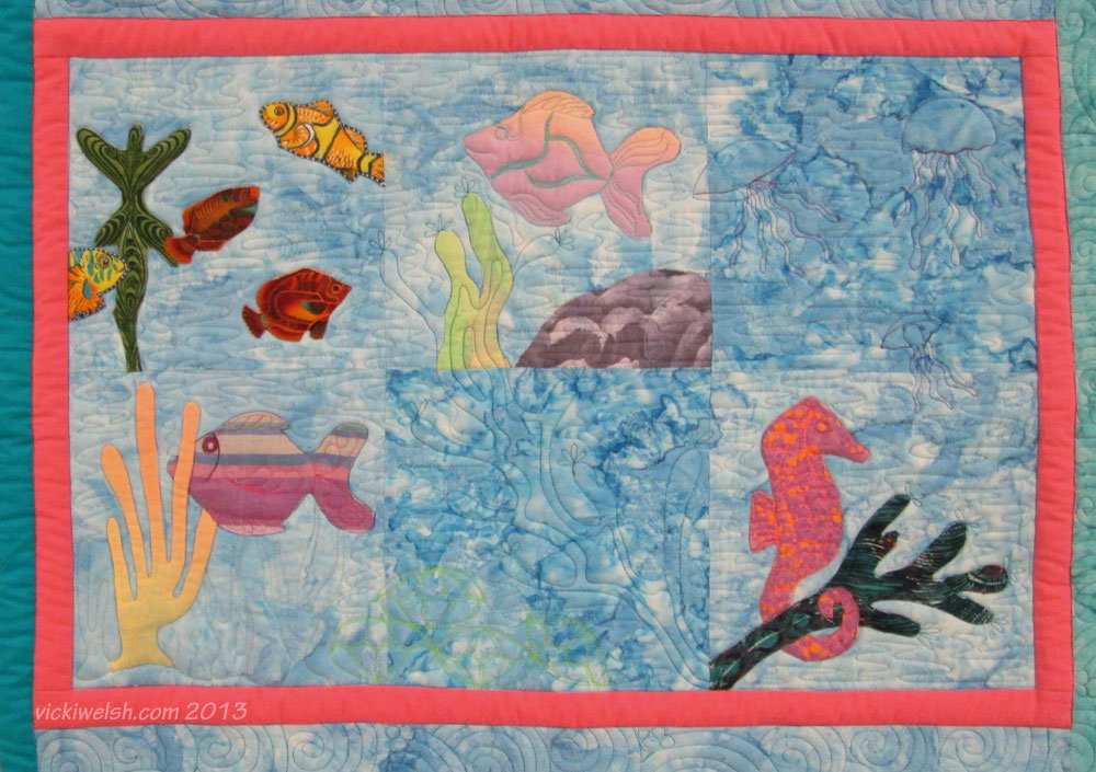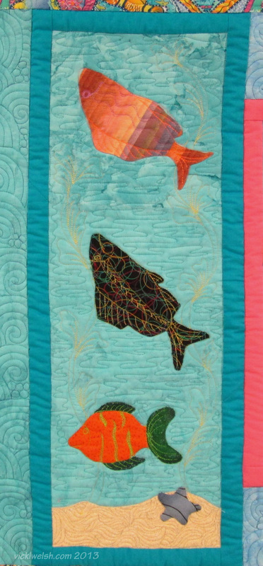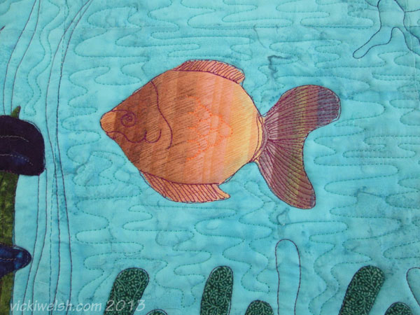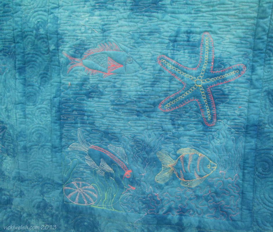 There are 7 panels on the quilt and I treated each one like a separate fish tank. Here are the 7 panels. Each panel has some sort of other creature added with just stitching. I also added seaweed and finished it off with water ripples.