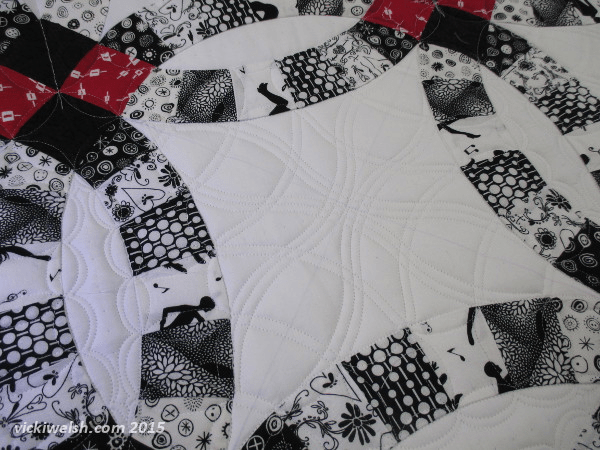 It has lots of ruler work and every time I tried the move the ruler the machine would stitch in place 5 or 10 times and usually break the thread. It drove me insane. I would lay in bed at night trying to figure out how to put more friction on the rail to make it less sensitive. I contacted APQS for advice and they told me that I “just” needed to pause the stitch regulator every time I needed to move the ruler. Do you have any idea how much extra time that takes? I couldn’t believe it.