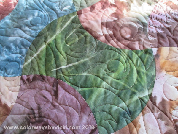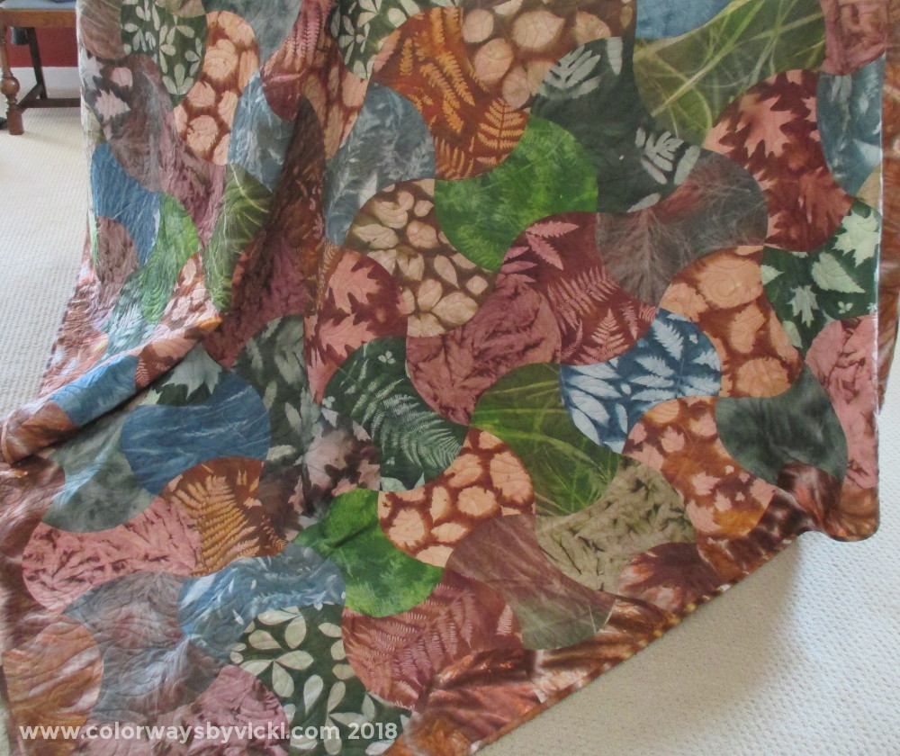 It’s a really simple quilt but it’s one of my recent favorites. This quilt started on vacation in August 2017. We stayed on a beautiful lake near Dover-Foxcroft, Maine. I tool about 9 yards of fabric with me and a bunch of DyeNaFlow paints. I spent two afternoons reading a book and sunprinting tons of fabric.