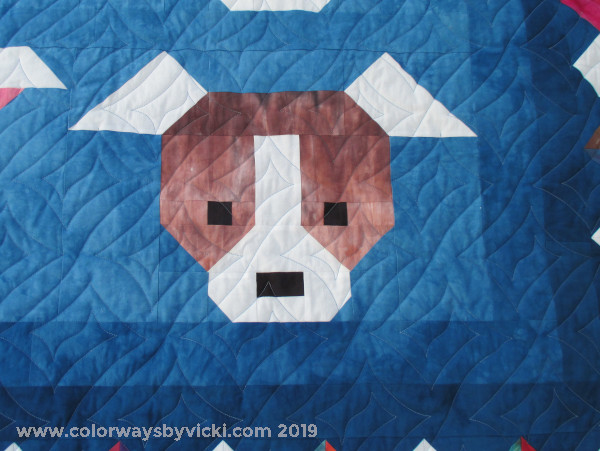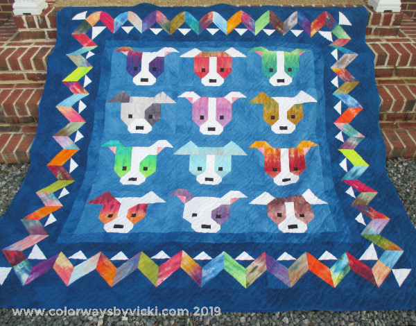 I made this quilt for my friend, Lora, to celebrate her retirement in 2019. She works with a pet rescue organization and is 100% devoted to dogs. When I saw this pattern, Dog Gone Cute, by Sew Fresh Quilts I knew it was for her. The pattern makes a 60″ quilt but that wasn’t big enough. I designed the zig zag border to make it bigger.