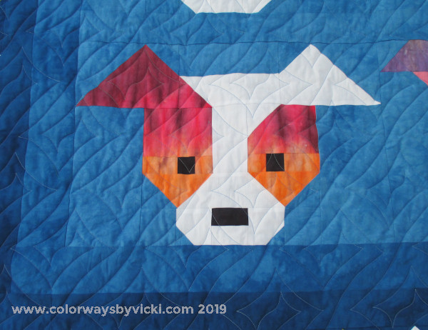 The fabrics are all hand dyed. I used 3 shades of the blue background to give a little of a gradient effect. The color fabrics are from my “waste fabric” collection.
