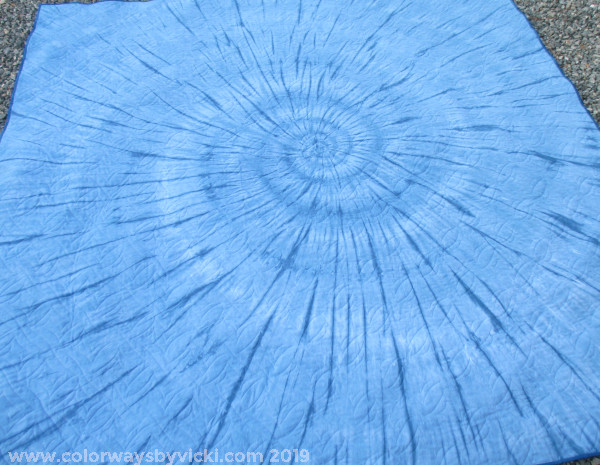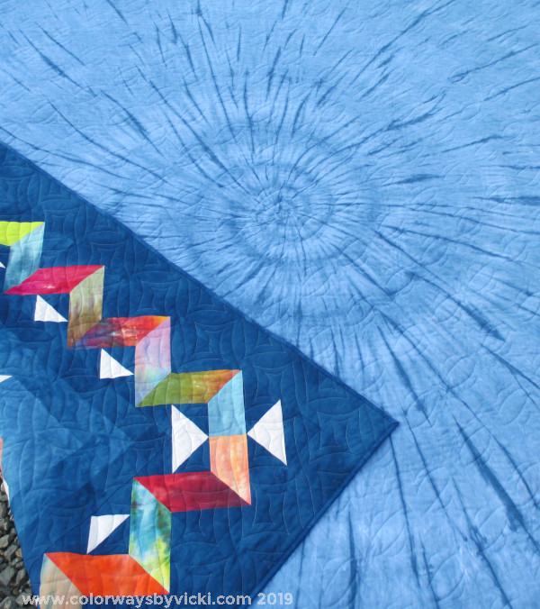 The backing is a monochromatic spiral using a lighter shade of the blue on the front. It was loaded to the longarm using my Centering a Quilt Back technique.